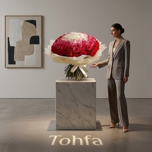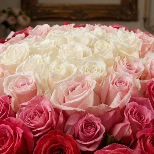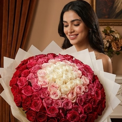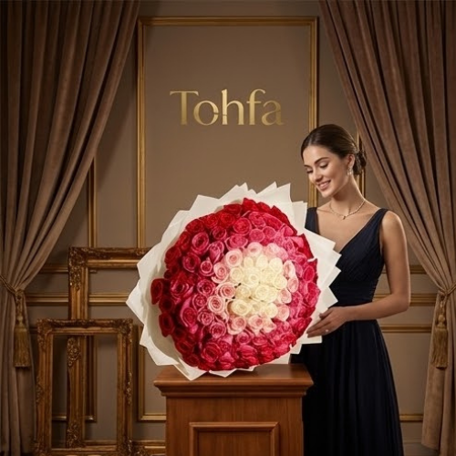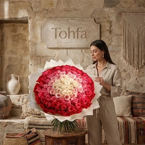 احتفل بأي مناسبة مع باقة الورود السيمفونية الأنيقة لدينا! تتميز هذه الباقة الرائعة المنسقة يدويًا بمزيج متناغم من الجوري الحمراء والوردية والوردية الفاتحة والفوشيا والبيضاء، مما يخلق مجموعة مذهلة من الألوان والأناقة. ملفوفة بورق أبيض نقي، فهي توفر لمسة خالدة ومتطورة لهديتك. مثالية للتعبير عن المشاعر الصادقة أو إضافة لمسة من الجمال إلى أي احتفال، تجمع هذه الباقة بين السحر الكلاسيكي والألوان النابضة بالحياة، مما يجعلها خيارًا مثاليًا لأولئك الذين يقدرون كل من النعمة واللون في هداياهم الزهرية.