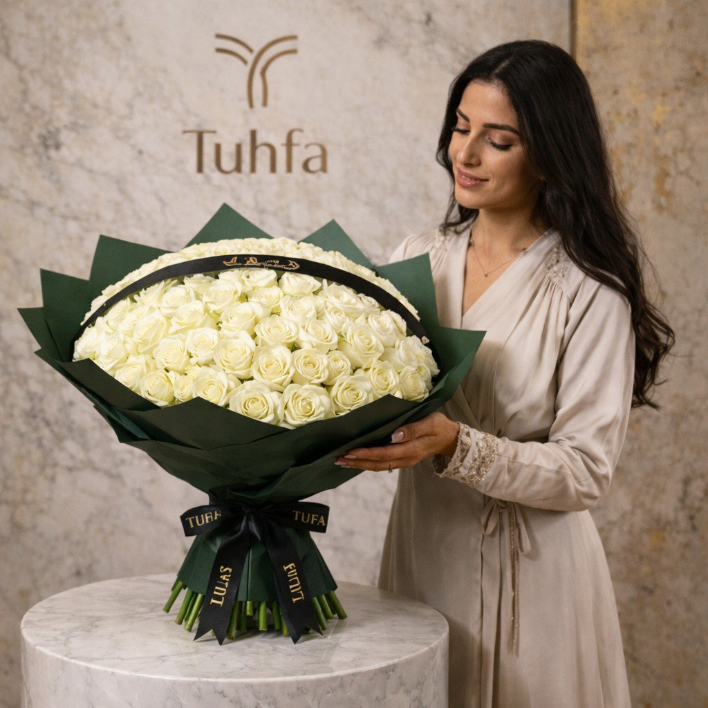 اجعل لحظاتك أكثر تميزاً وسحراً مع باقة جوري الأبيض في غلاف أخضر داكن. تجمع هذه الباقة بين نقاء زهور الجوري البيضاء، التي ترمز إلى الصفاء والأناقة، والغلاف الأخضر الداكن الذي يضفي لمسة من الفخامة والتميز. التنسيق الرائع بين الألوان يخلق توازناً مثالياً يعكس ذوقك الرفيع ويجعل من هذه الباقة هدية مثالية لأي مناسبة. سواء كنت تحتفل بإنجاز، أو ترغب في إهداء شخص عزيز، فإن باقة الجوري الأبيض في غلاف أخضر داكن ستضفي لمسة من السحر والجمال على كل لحظة اطلب الآن لتستمتع بهذه الزهور الرائعة وتضيء يوم أحبائك.